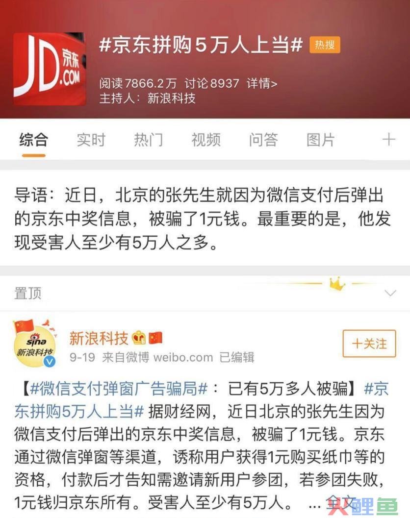 9月中旬,#京东拼购5万人上当#上了热搜,因为京东采购了线下微信支付后的展示广告:用户会看到一个1分钱买纸巾等商品的资格,但支付后才知道需要继续邀请京东新用户参团,这个商品才能邮寄给自己,拼团不成功1元不退。