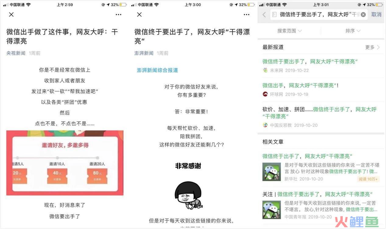 同时在微信上搜了一下,发现央视新闻、新华网、澎湃新闻、各地电视台等公众号都纷纷推文:微信封禁砍价拼团,网友大呼“干得漂亮”。微博和微信上的普通用户评论全是“双手支持”、“早就不堪其扰”等。