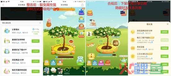 左边两张图是“多多果园”整改前的截图,右边两张图是整改合规后可以在微信里正常访问的截图:下架了所有的诱导用户分享的按钮、隐藏了好友列表,在App里引导用户完成浏览商品、购买商品等任务(不在微信生态)。