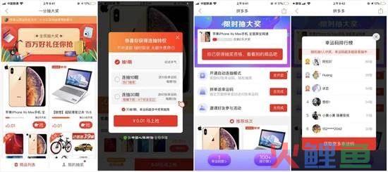 拼多多的合规整改方式是直接把“拼团”元素删除,变成“1分钱抽奖”(没中奖可以退钱,如果不退会有法律风险);用户支付1分钱即可获得抽iPhone X的1个幸运码、通过邀请好友参与活动、购物可以增加幸运码数量,幸运码越多,中奖概率越高。