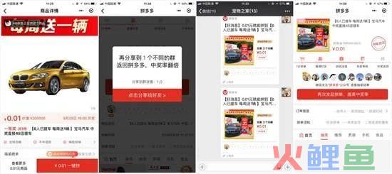 拼多多刚崛起的时候,当时微信支付的规则是:只要你向拼多多支付了1分钱、就会默认关注拼多多的公众号。所以就有了1分钱拼水果、1分钱拼iPhone、随着用户的阈值越来越高后面是是1分钱拼宝马(活动规则就是你支付1分钱开团、这个团满x人了,才具备1个抽奖资格)的抽奖性质的拼团活动(江湖传说拼多多靠这个玩法涨粉1千万)。