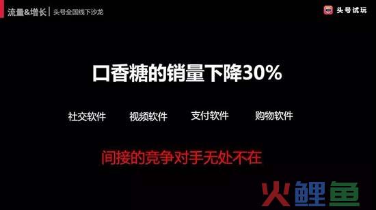 同时,支付和购物软件其实大大的弱化了购买口香糖的场景。大家可以想想看,口香糖大部分时候你们会什么时候买?去便利店,然后看到货架上面有一排口香糖,顺手拿一个。但是网上购物的普及,口香糖只有在客户明确想要购买的时候才会出现在购物车里。