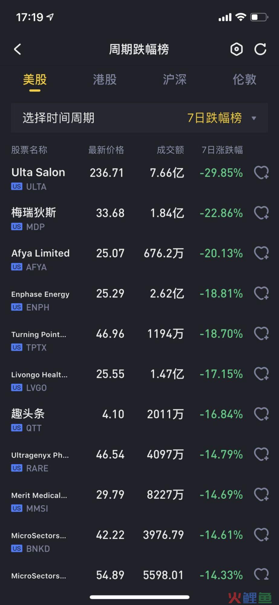 又比如,点击发现>>机会,里面会显示各种股票榜单,包括周期涨幅榜、周期跌幅榜等,这些榜单可以为我们提供一些新的投资思路,比如,对于一些业务没有硬伤、而近期却因为一些暂时性因素而股价大跌的企业,我们就可以考虑 “抄底”。
