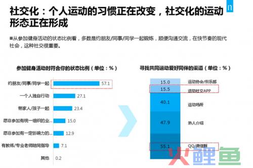像陈先生这样有社交需求的锻炼者并不在少数,尼尔森发布《2017互联网体育消费报告》指出,有57%的人会邀约朋友、同事、同学一起锻炼。超过半数的锻炼者会通过健康类APP、QQ/微信等渠道寻找有共同运动爱好的伙伴,也更愿意将自己的运动时刻分享给亲朋好友,通过社交化运动形成新的社交圈已成为一种时尚健康的生活方式。