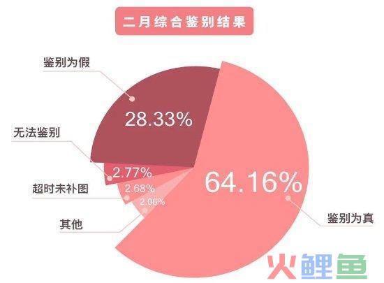 根据心心App官方数据统计,二月综合鉴别结果的正品率为64.16%,假货率28.33%,超时未补图2.68%。