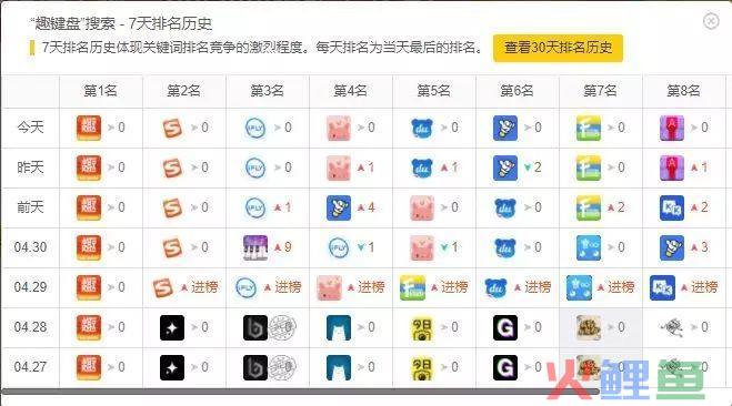 而观察“趣键盘”一词,8943的关键词热度,搜索结果却只有30。在4月27日“趣键盘”上榜Top10后,“搜狗输入法”、“讯飞输入法”、“表情符号键盘”、“百度输入法”等同类产品开始发力蹭量。