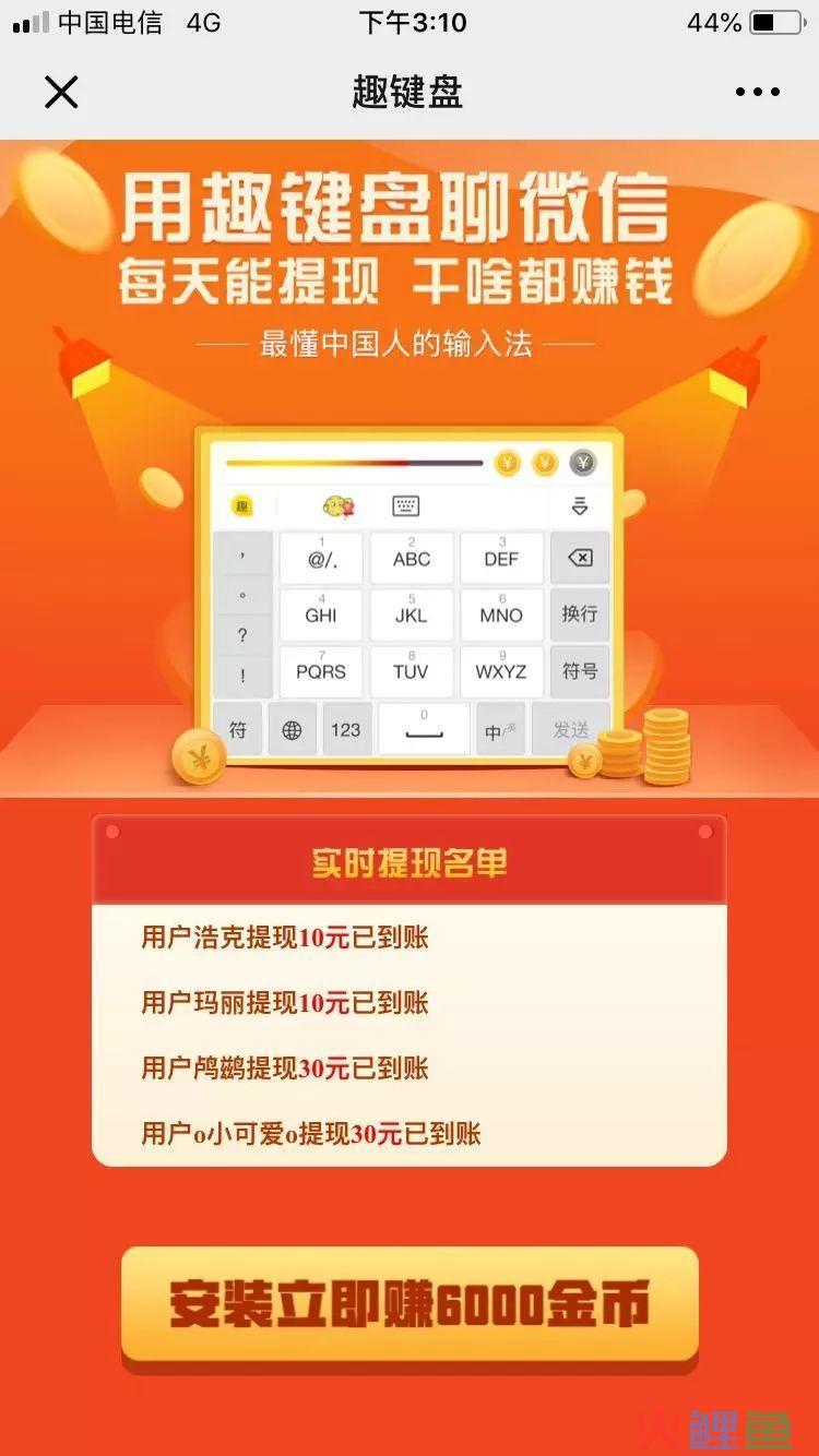 尽管“趣键盘”分享页面“安装立即赚xx金币”的广告语并没有直接用“安装立即赚xx现金”(1000金币≈0.1元),但提现名单的罗列却无形中夸大了安装的利益效果,因此在面对一种更便捷的赚钱方式面前(输入法的应用在网络时代可谓如影随形,用户或许会提前预判对输入法的使用量远远要大于资讯、视频、小说等非刚需产品)这种利益驱使下能迅速占领用户心智,形成口碑传播。
