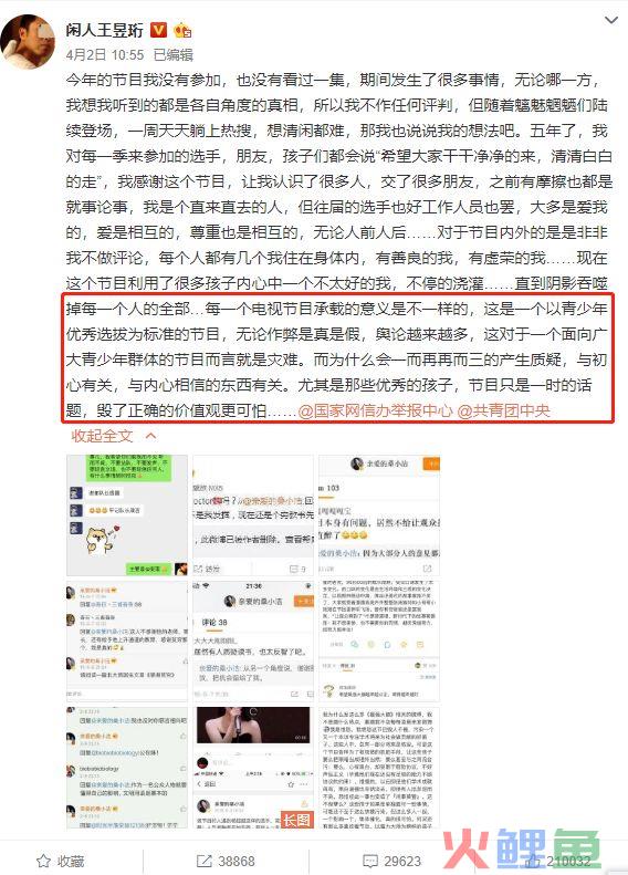 由于节目话题的热炒,第二届《最强大脑》以观察水而闻名的“水哥”王昱珩也被牵涉进来,屡次被提及的水哥王昱珩终于在4月2日做出回应,表示自己不想评判谁,只是奉劝节目组要保持初心、保护好孩子们的价值观。