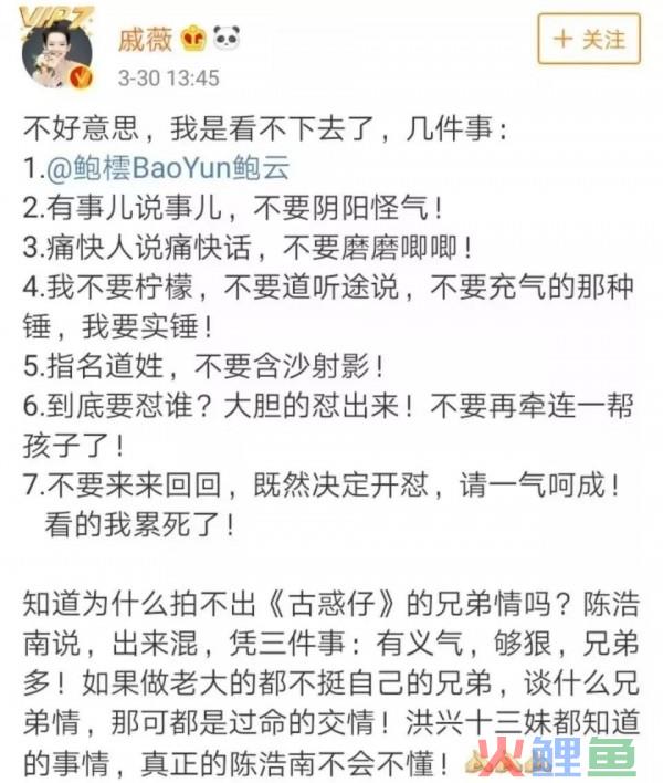 故事转折发生在3月30日,在节目中与魏坤琳携手的戚薇在社交媒体上下场开怼鲍橒从道义出发,认为对方不讲兄弟情。