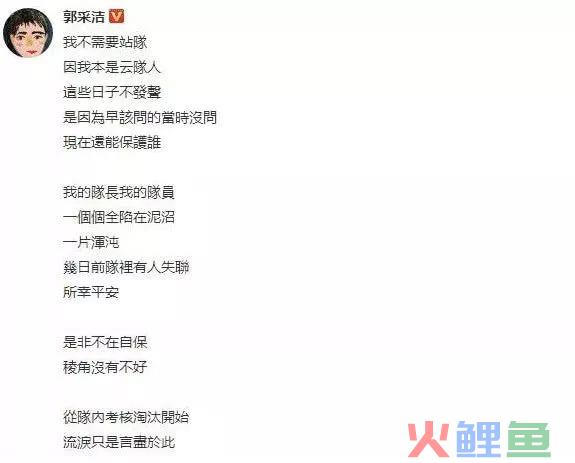 节目中与鲍橒合作的女明星郭采洁也火速在声明发布后下场站队,力挺鲍橒和自己的队员们,表示自己在维护队员们的正义。