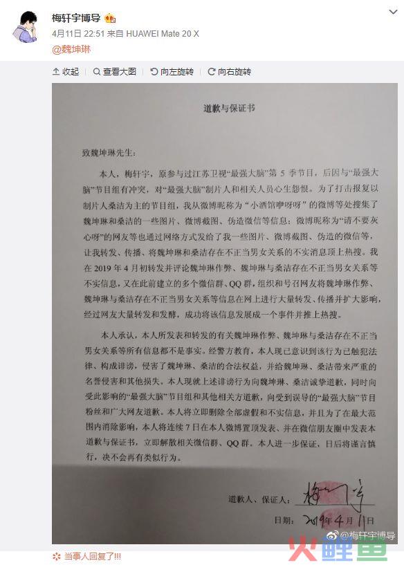 4月11日晚,曾被《最强大脑》制片人桑洁骂是“学渣”的前最强大脑选手梅轩宇在微博突然给出了一份《道歉与保证书》,并且直接@了魏坤琳。