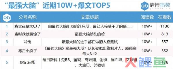 其中阅读量达到10万+以上的文章有5篇,关注最高为公众号“我实在是太CJ了”的文章《由最强大脑引发的连环瓜,最让人接受不了的是……》,获得了1136个在看推荐。