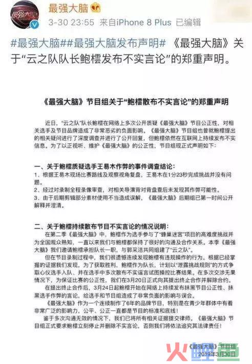 事情的再一次转折发生在3月30日,之前对作弊事件一直回避的《最强大脑》节目组,突然发表一篇声明,称鲍橒队长因为违规操作,被节目组发现,已经于3月20日正式终止合同。声明中还指出,鲍橒在网络上质疑节目组的行为,是报复性抹黑节目组。