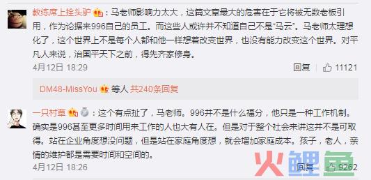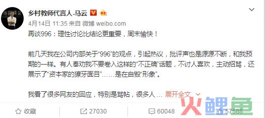 4月11日晚,阿里巴巴董事局主席马云在阿里内部交流活动中跟员工们交流了996这个话题。他指出996是互联网人修来的福报,随后这一言论在网上引发的了轩然大波。网友纷纷到马云微博下留言吐槽。