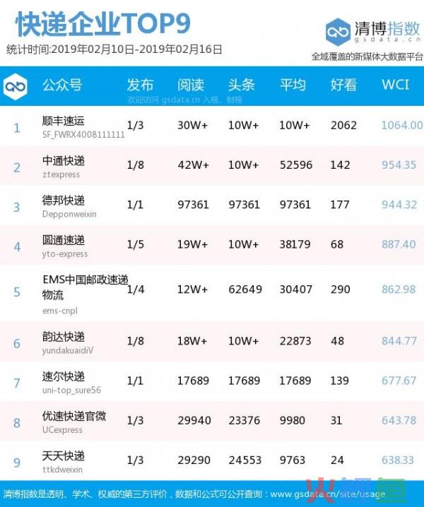 快递企业榜:“顺丰速运”篇篇10万+强势霸榜