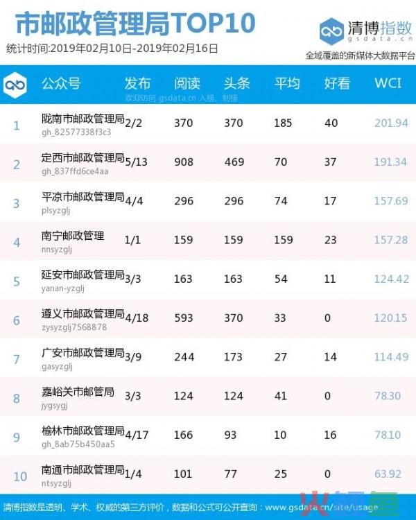 “陇南市邮政管理局”发挥优秀,其发文2篇,获得了370的阅读量,以201.94的WCI值蝉联桂冠。与上周相比,阅读量减少了97,好看量减少了16。
