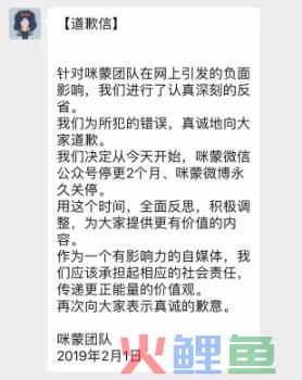 2月1日,咪蒙在其微博发布道歉信称,“针对咪蒙团队在网上引发的负面影响,我们进行了认真深刻的反省。我们为所犯的错误,真诚地向大家道歉我们。决定从今天开始,咪蒙微信公众号停更2个月、咪蒙微博永久关停……”
