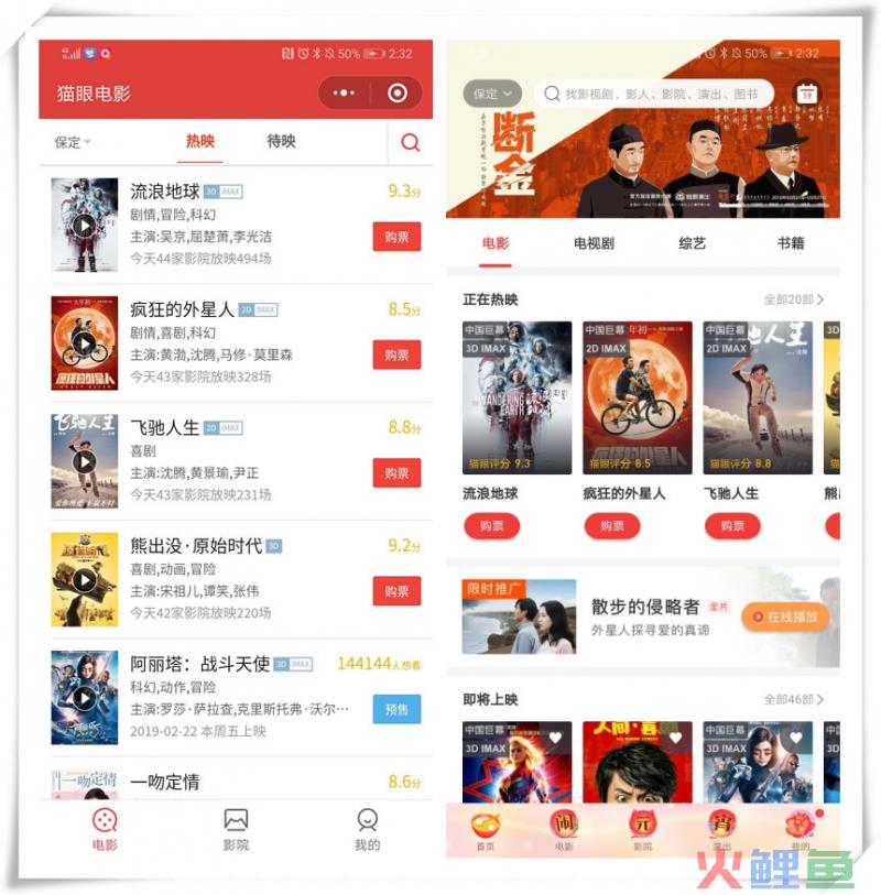 (左侧:猫眼电影APP界面;右侧:猫眼电影小程序界面)