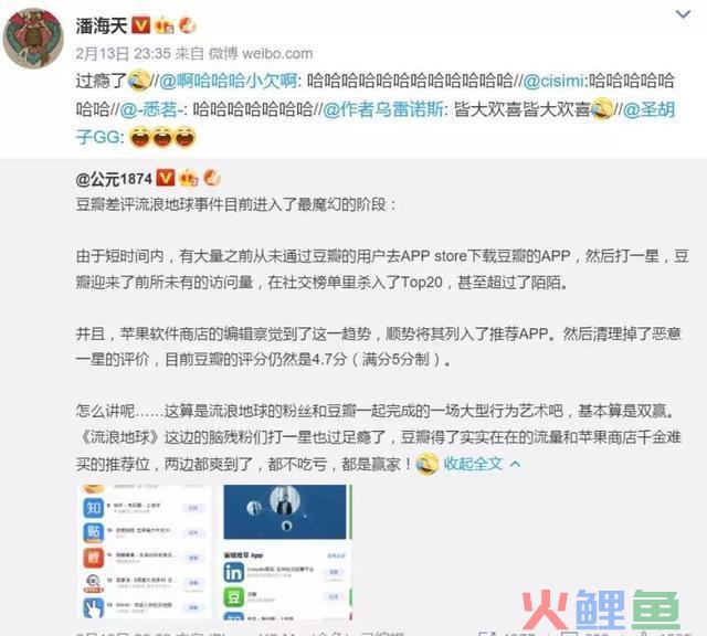 2月13日晚,一旁观网友的神评论被翻牌,称此次的豆瓣差评事件最终进入了双赢阶段。营销or突发事件又一次让吃瓜群众陷入谜团。