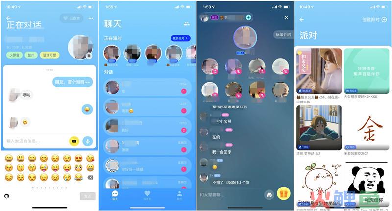 (从左至右:对话框界面、聊天界面、派对界面、派对展示界面)