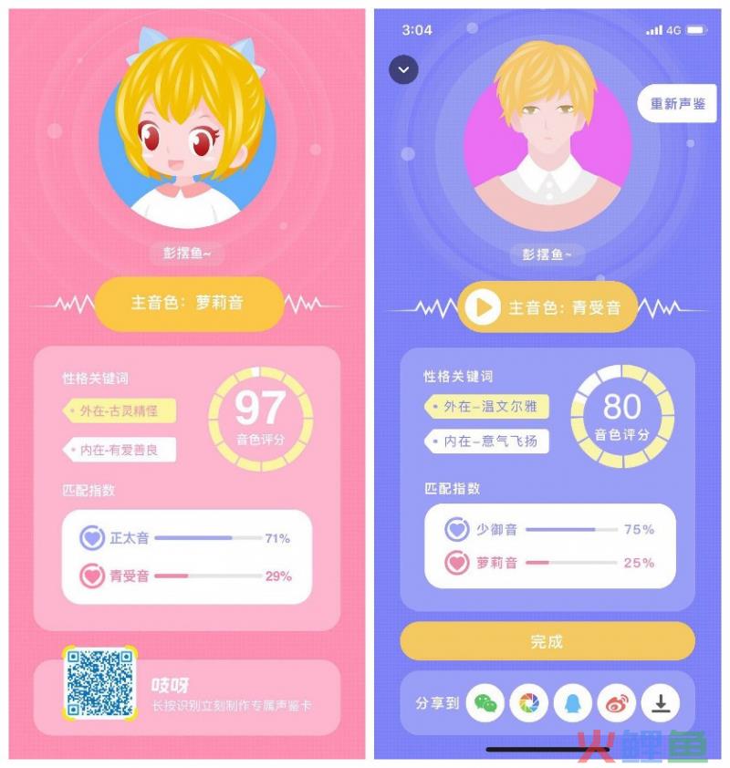 4.3 声音标签玩法让二次元风的95后感觉更有趣;吱呀App体验的这几天,发现年轻用户群体占比较高,当然这也符合陌生人社交人群覆盖的特点。95后一代偏爱二次元风,吱呀声音名片的设计充满了二次元元素,例如说卡通头像的设计,以及性格关键词的漫画感:女生分为萝莉音、御姐音、女王音,男生分为正太音、青年音、青叔音,二次元感或许也是吸引95后的重要因素。