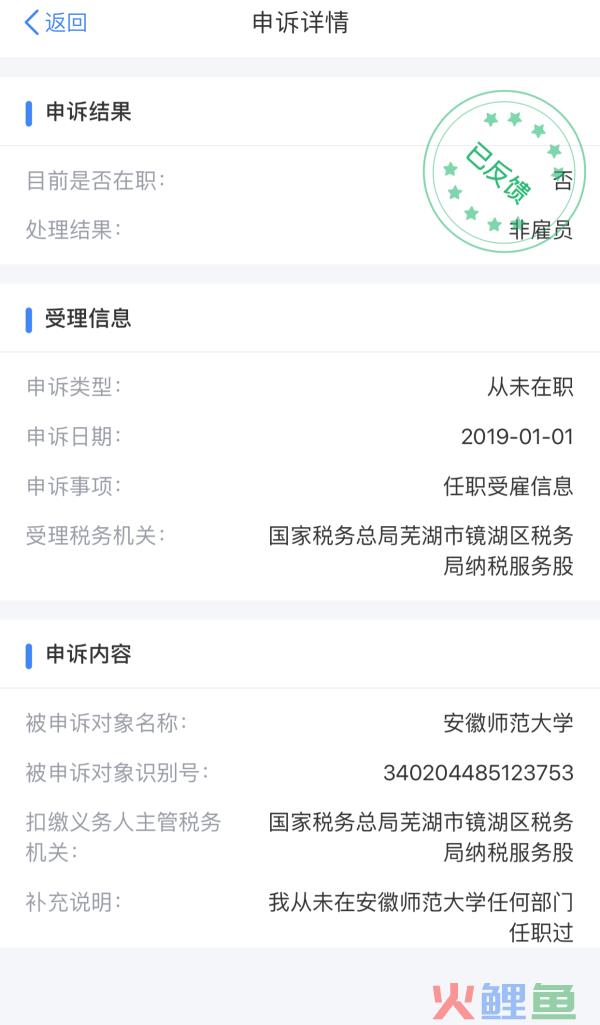 对于这种“被入职”的情况,国家税务总局此前回应称,遇到这种情况,可能是个人身份信息被冒用了。一方面可以在App上点击该单位名称,并通过右上角的“申诉”按键发起申诉;另一方面,税务部门将尽快核实处理涉税信息冒用问题,如果属实,税务部门将对冒用单位或个人的涉税违法问题依法处理。
