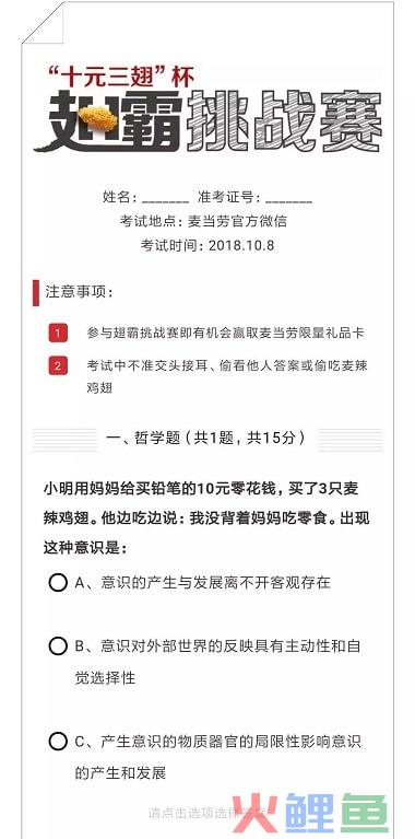 而麦当劳的目的就纯粹,向大众推荐自家的鸡翅套餐,同时增粉。通过答题的形式,吸引更多线上关注,再凭借答题互动的促销手段,加强记忆点。