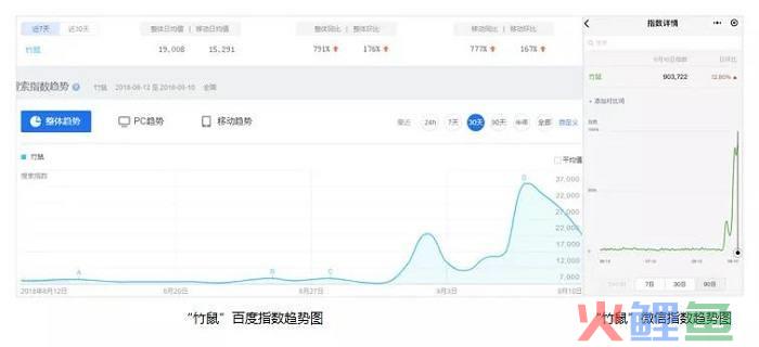 从下图可以看到,“竹鼠”一词的百度指数在近日提升了1000%,而其微信指数更是飙升45倍。