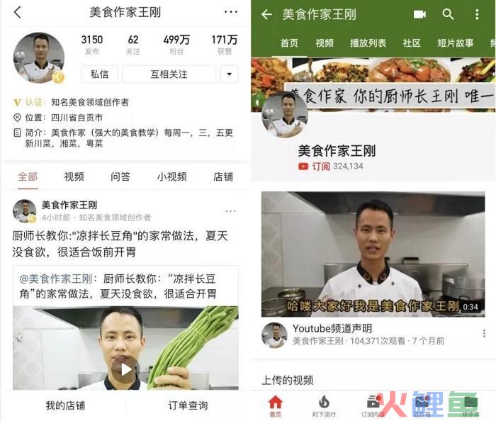王刚的硬核烹调视频在今日头条获得将近500万粉丝,累计超过1.1亿次播放量,在B站播放量也动辄几十万+,甚至还走出国门,在YouTube上获得外国网友喜爱。