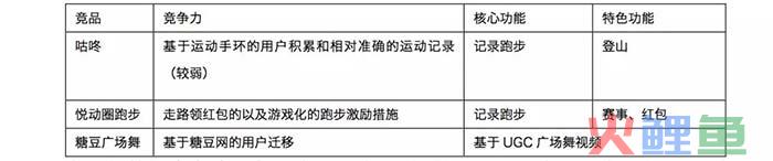 产品的核心竞争力一般与产品具有强关联性,也是用户选择产品的重要原因之一。也是产品的重要护城河,核心竞争力弱就说明护城河不强,容易被替代。咕咚的核心竞争力在于其先发制人的用户积累,但2015年时,咕咚日活也并未超过300万,说明此护城河并不具有明显竞争力。其功能更倾向满足用户的户外运动需求,如跑步、登山等。