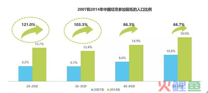 回到keep上线之前的背景,2014年10月,国家发布《关于加快发展促进体育消费的若干意见》标标志着,全民健身已经上升为国家战略。此时,国家发布全民健身调查共服数据,相比2007年,整体全民运动健身的人群玻璃增长近8个百分点,尤其是20-40岁的人,锻炼人数翻了一番。
