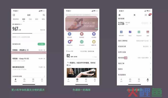 排版上,全部使用横向排版,连健身记录也采用横向分布的进度条形式,在视觉上保持统一。文字部分,除标题等重要文字使用黑色,其他辅助性文字均使用浅灰色,且字号相比其他APP更小,重点更突出且更精致。