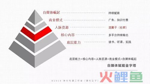 最后我们再来提出一个概念收尾,关于“自媒体赋能金字塔”。(底层能力+核心内容+人脉资源+商业模式=自媒体崛起)我们发现“混圈子”是其中很重要的一环,它可以提升我们的人脉资源。