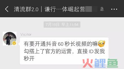 比如你在群里说:最近勾搭上了抖音的运营,可以无门槛开60S视频权限,需要的私聊我,仅限本群伙伴噢~这样的引流效果你想想能不好吗?