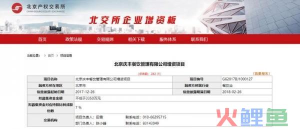 近日,北京庆丰餐饮管理有限公司通过北京交易产权所公布了增资项目,拟公开征集1家意向投资方,拟募资金额不低于3350万元,对应持股比例7%。