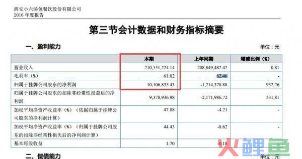 每经小编注意到,今年4月,小六汤包公布的2016年年度报告显示,2016年营业收入为2.11亿元,较上年同期增长0.81%;归属于挂牌公司股东的净利润为1010.68万元,较上年同期-121.44万元,扭亏为盈;毛利率61.02%,较上年同期下滑1.44%;基本每股收益为1.70元,上年同期为-0.18元。