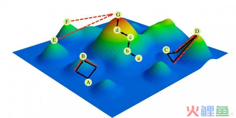 进化生物学上使用“适应度地形”这个正式的概念,但本文为了便于理解,另外设计了“进化势垒”的曲线图,两者在许多细节上都不尽相同,有兴趣的读者可以自己比较。