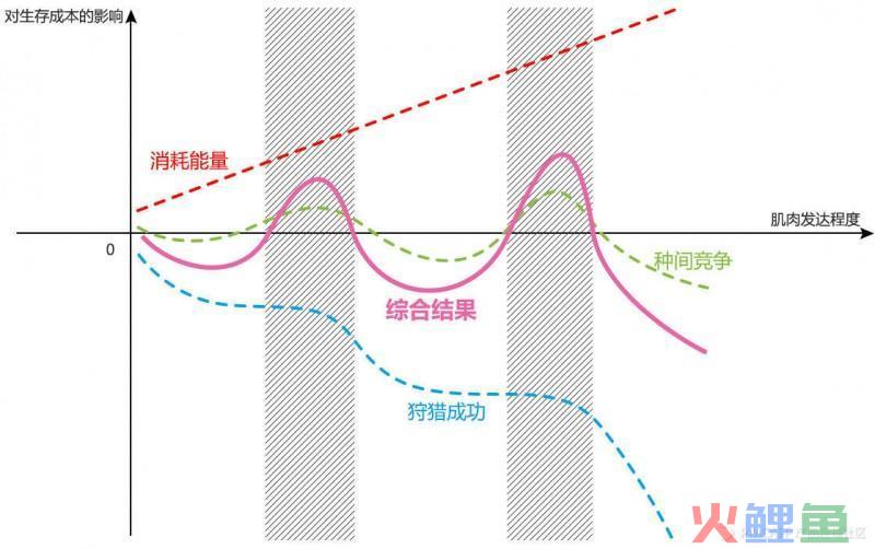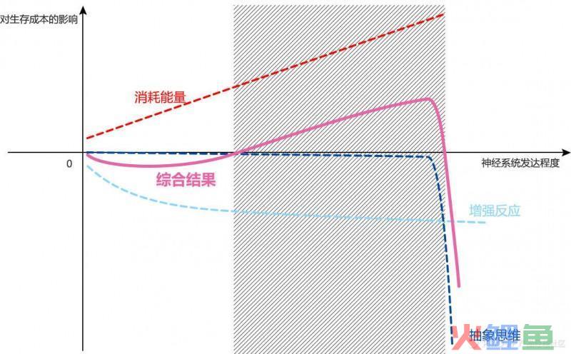 · 粉红线代表了这些影响的综合结果,也是就是它们的叠加。我们看到在较低的程度上,发展神经系统会带来优势;但优势会逐渐消退,超过某个阈值就开始表现为劣势,即中央的阴影区;直到在非常高的程度上,突然出现的抽象思维又会带来巨大的优势,冲出阴影。