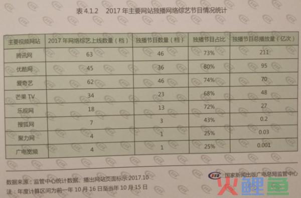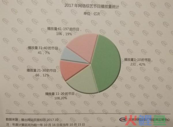 据国家新闻出版广电总局监管中心发布的《2017网络原创节目发展分析报告(网络综艺片)》(以下简称“2017网综报告”)显示,2017年新上线的网综有197档,播放量总计552亿次,同比增长120%。其中,排名前十的综艺播放量达231亿次,占总量的42%,头部效应明显。