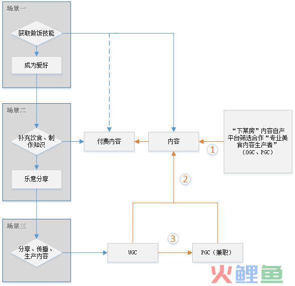 笔者绘制一张草图更清晰的展示我研究的“下某房”知识付费可能存在的模式,同时包括其余的菜谱类产品。 橙色箭头部分是我对菜谱产品知识付费探索方向的研究 使用过菜谱APP都应该知道,菜谱就像攻略一样,做菜步骤搭配配图能很详细说明菜谱做法。 既然如此详细,还需付费?如此认为的一定不是菜谱知识付费的目标用户,这部分用户是场景一下的用户,看图中虚线,这部分用户只意味着有付费可能,这里的知识付费针对的核心用户是场景二、三的用户。 为菜谱内容付费有先例,菜谱付费并非新名次,最直接例子就是目前各大媒体依然存在和不断创新玩法的做菜节目,说明观看菜谱的市场依旧很大。做菜节目一方面是以娱乐大众为目的,另一方面就是展示每到菜的制作步骤和过程,传递菜谱内容及制作知识,节目的播出吸纳的是广告费,广告的目的是吸引用户消费,用户是间接买单者,就是常说的“羊毛出在羊身上”。如央视2台“回家吃饭”、颇受中老年人喜爱的BTV“养生厨房”等等。 那么如何让用户心甘亲愿的位知识付费呢? 首先菜谱一定不是家常菜,也绝不是切切剁剁工艺简单的菜 我研究总结应该有以下几点:- 独有性:说到完全独有的情况几乎不可能,这里说的独有是门槛高,举个例子:一般上网搜不到、找到的信息不全等,用户在急迫的情况下,会取舍付费和时间之间,从而在价格合适的情况下放弃查找,因为懒得费劲和浪费时间更令人头疼。