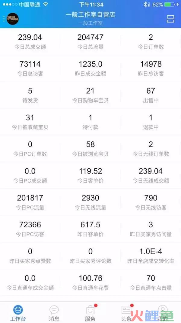 这是一般工作室某宝店铺的销量显示,广告费 100.76 元,销量 239.04 元,订单 2 笔,史上销量最低一次。