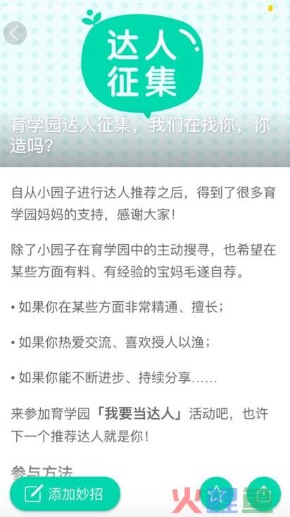 我认为在前期,是需要官方和用户共同维护妙招的质量和氛围的,例如鼓励大家发布高质量妙招、鼓励大家对于有误区的妙招进行反馈。在这个阶段,培养一批高质种子用户是最合时宜的,她们是生活中的育儿达人,践行科学育儿、且乐于分享,通过对她们的维系,既能产生大量符合产品调性的UGC内容,又能为其他用户树立标杆。而两年后,育学园上线“我要当达人”长期活动,希望发现更多在某方面有料、有经验的宝妈,通过这一运营,既提升用户发布积极性,又明确了优质内容的标准。