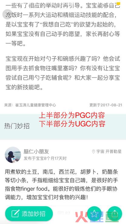 产品刚上线时,大部分的PGC内容下都会有几个质量比较高的妙招,是关于该主题下的用户经验总结,猜想是崔玉涛团队邀请了一批高质粉丝完成了内容初始化的运营,这在一定程度上告诉了用户好的妙招标准是怎样的,鼓励用户按照此发布自己的育儿经验。