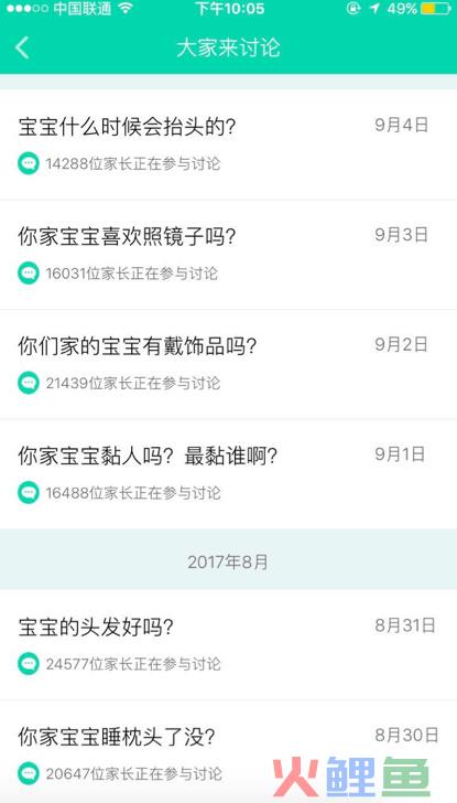 为了更好的营造社区氛围,产品上新增“一起讨论”版块。由育学园小编每天选择一个话题引导大家讨论,在前期,话题本身仍然是依附在具体的知识贴下,当用户看到该知识贴时,也看到了小编引导大家进行的讨论,沉淀的内容得以不断分发给其他用户。