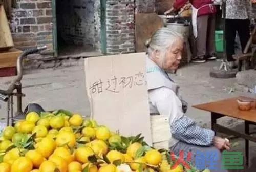 这应该是民间最火的文案。除了形象化表达橘子的口感,还有整个画面的强烈反差。初恋和老奶奶,这大大加强了情感的渲染。