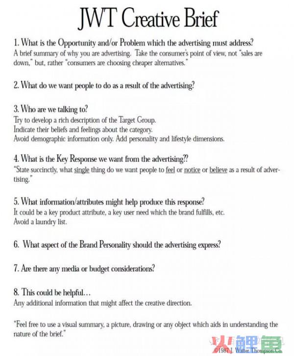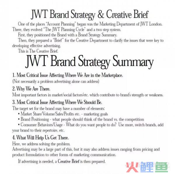 上面两P是JWT的策略模型,分成两步:1.brand strategy summary将重要的市场情况以及目标明确 ;2.creative brief明确广告要解决的问题、目标消费者情况、品牌/产品价值点等