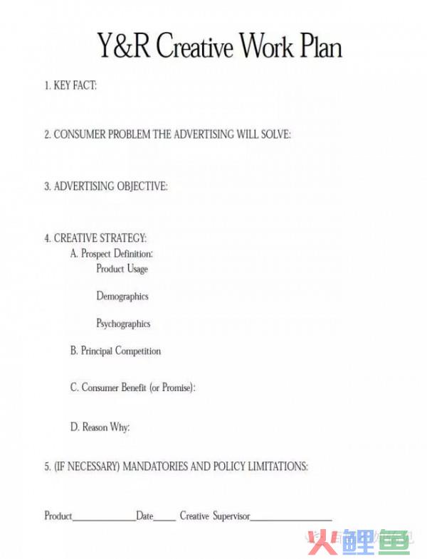 Y&R也是比较注重工作方法的公司,这里是它们的creative work plan,第一P是框架结构,非常简单清晰,不过我认为要掌握好第一步的FACTS分析也挺难的。
