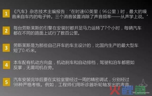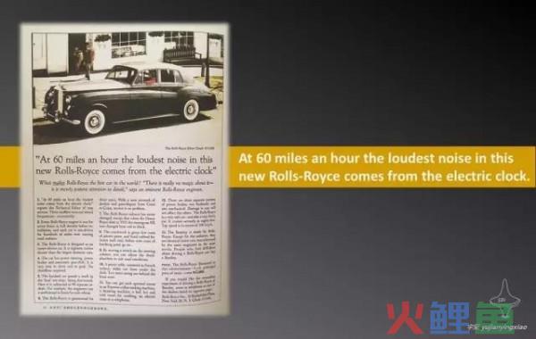 奥格威的多数创作都有这种“讲事实”的重要特征。比如,他为劳斯莱斯广告写的标题:“在时速60英里时 这辆新劳斯莱斯最大的噪音来自它的电子钟。”就被公认为平面广告史上最精彩的长文案之一,而该标题的成功,恰恰在于展现了生动的事实细节。