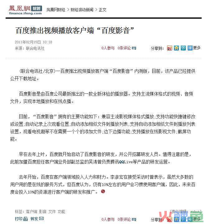 我仔细分析了下用户新增来源,60%以上的用户来自QVOD、酷狗等流媒体软件,以及各类软件下载渠道。很不幸的是,这些公司大多老周都是股东,而且在董事会占有很重要的分量。特别是QVOD快播,不仅是百度工具栏的主要安装来源,更是360安全卫士的主要安装来源。为了让用户新增渠道安全度提升,也为了有效打击对手,果断申请要做“百度影音”这个产品。PC-core也非常支持,当时还专门在Robin大会议室开了一个汇报会,各位e-staff成员一致通过要马上开始。