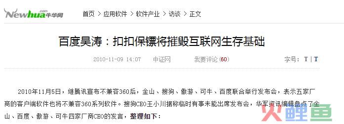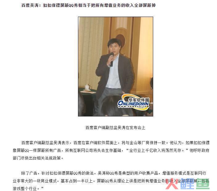 后来傅盛团队在国贸大厦做了一个新闻发布会,因为我们的合作关系,我也去助战了下,重点是希望引起互联网监管部门的高度重视。由于360安全卫士当时出了一个“扣扣保镖”的产品,可以屏蔽QQ秀等腾讯增值业务和屏蔽互联网广告产品,我也刻意提醒了下,希望得到腾讯以及各个门户网站的高度关注。